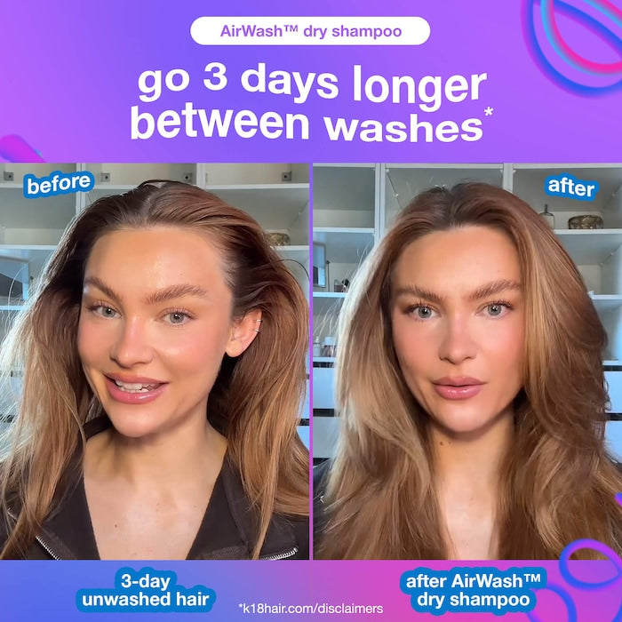 What Else You Need to Know: The DAMAGE SHIELD shampoo and conditioner help prevent damage, tangling, frizz, and color fade while protecting against UV, environmental, and mechanical damage for up to three days. Powered by the patented K18PEPTIDE™ to fortify hair during washing. AirWash™ Dry Shampoo is clinically proven to eliminate odor and reduce oil + sweat for up to three days. The dry shampoo uses a patented odorBIND™ smart-release biotechnology which detects and clinically eliminate odors, translucent microbeads absorb excess oil, without leaving behind starchy buildup or white cast.