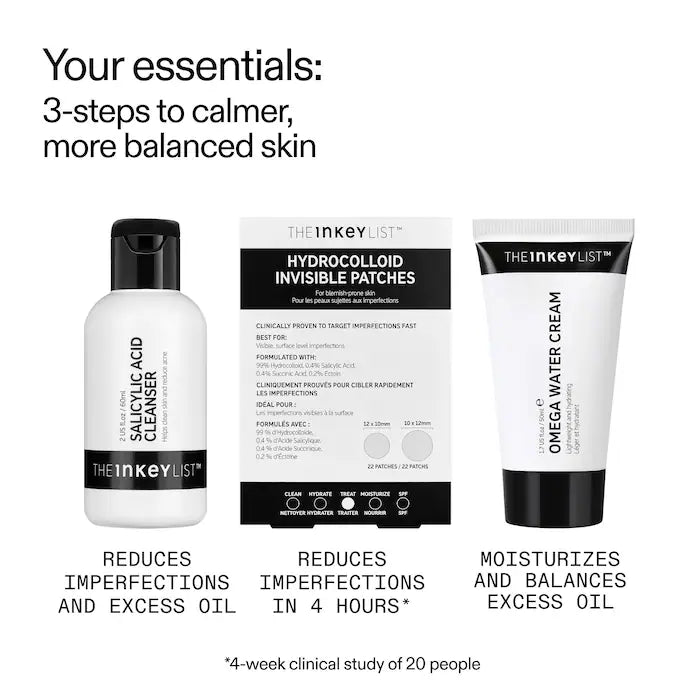 What it is: A set to help you visibly clear, calm, and balance acne-prone skin with Salicylic Acid Cleanser, Omega Water Cream, and fast-acting Pimple Patches.
