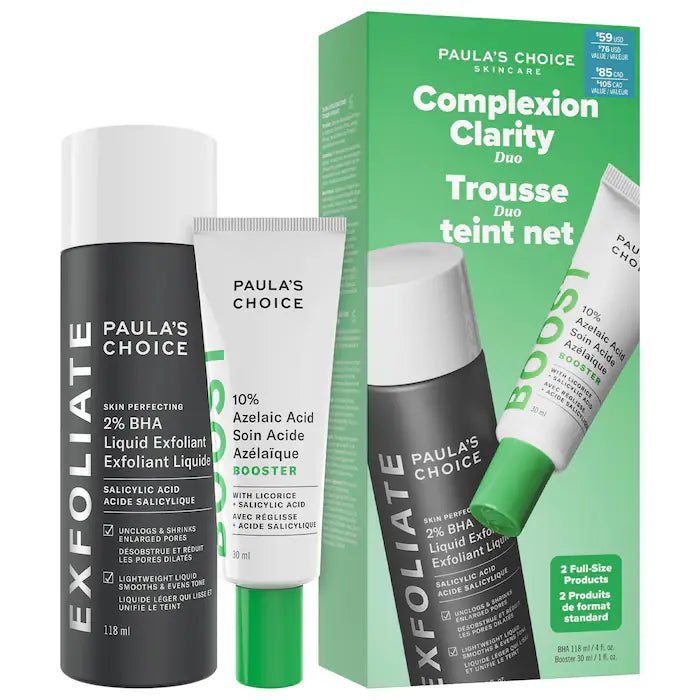 What it is: A bestselling 2% BHA Exfoliating Toner and 10% Azelaic Acid Booster duo to quickly unclog pores, visibly even tone, and clarify skin.