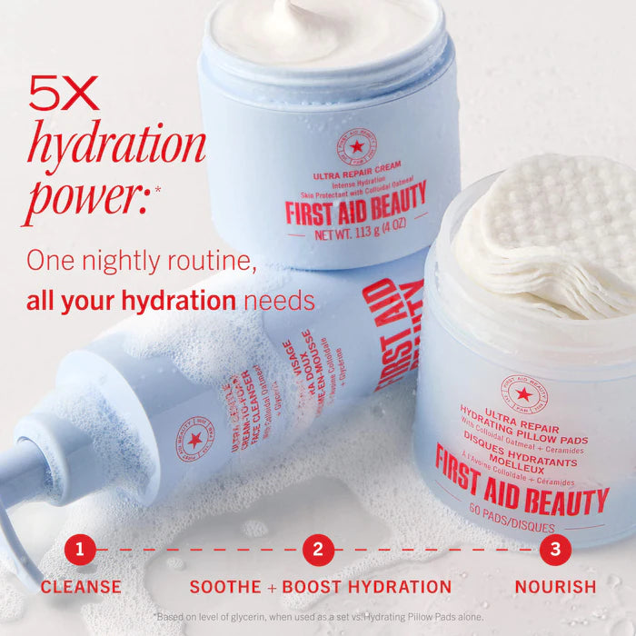 What it is: A three-piece set with Face Cleanser, Hydrating Pillow Pads, and Ultra Repair Cream in new packaging for a gold standard routine with five times hydration power.